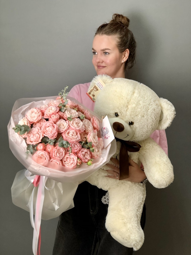 - Сочетание. Медведь + букет роз или пионов — это уже композиция. Такой медведь с цветами моментально превращается в подарок-историю.